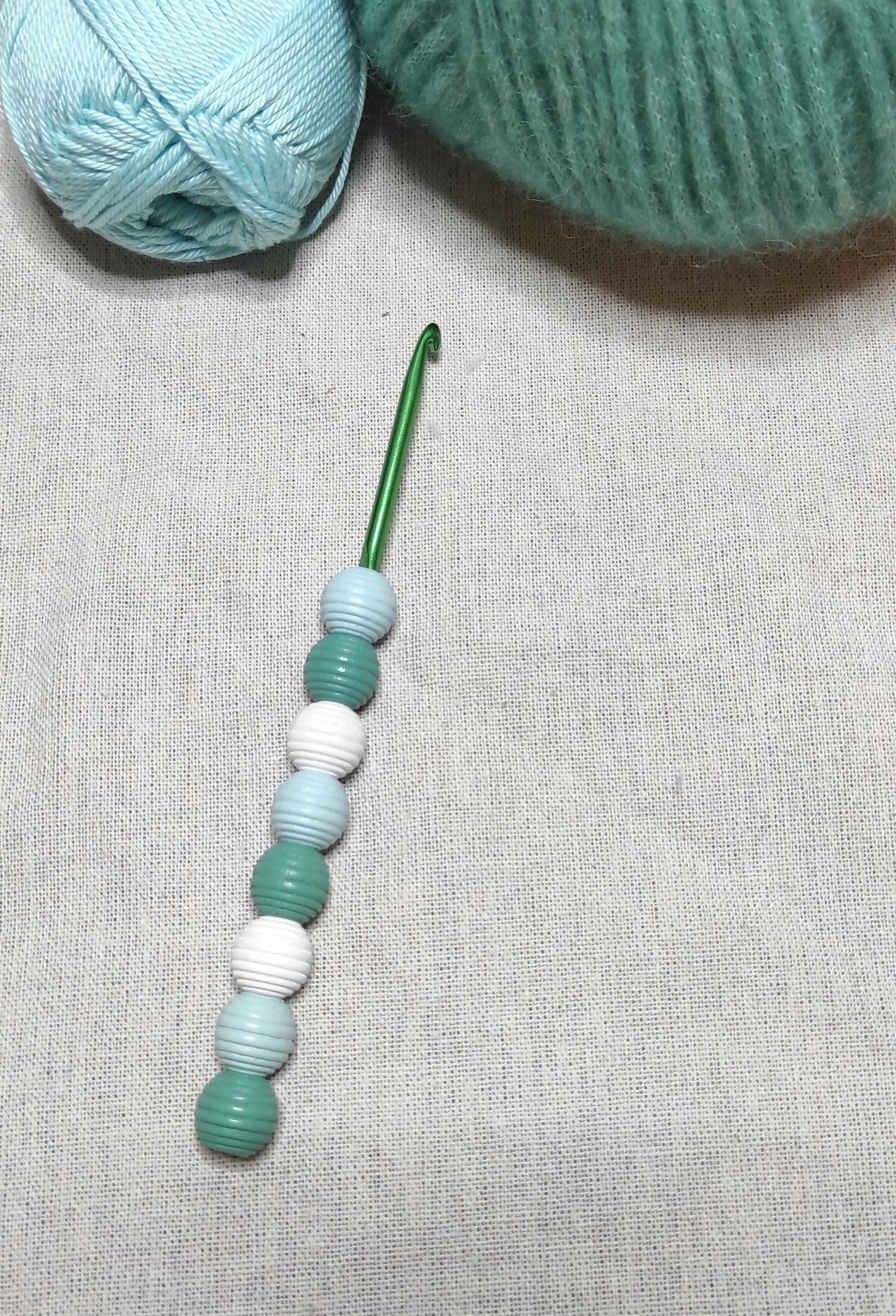 Háček má rukojeť z dřevěných korálků. Velikost háčku je 4.