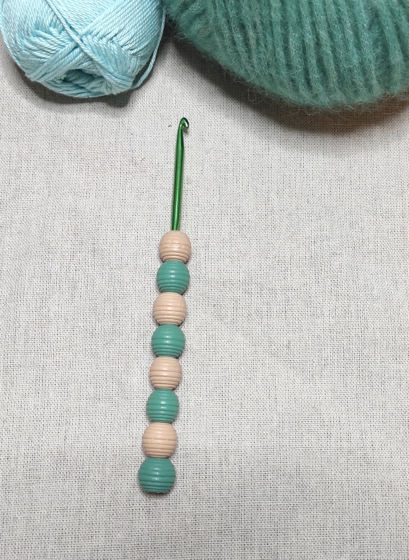 Háček má rukojeť z dřevěných korálků. Velikost háčku je 4.