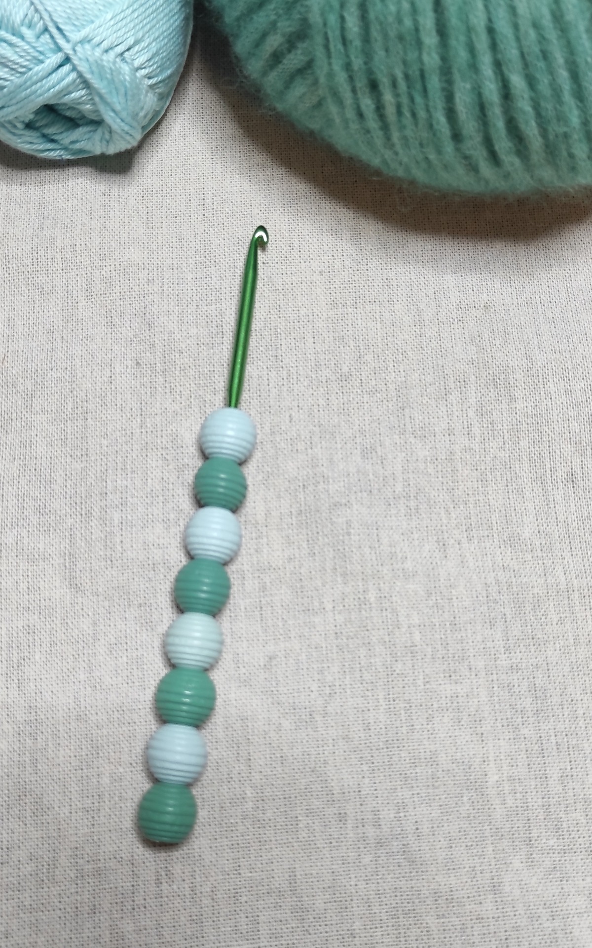 Háček má rukojeť z dřevěných korálků. Velikost háčku je 4.