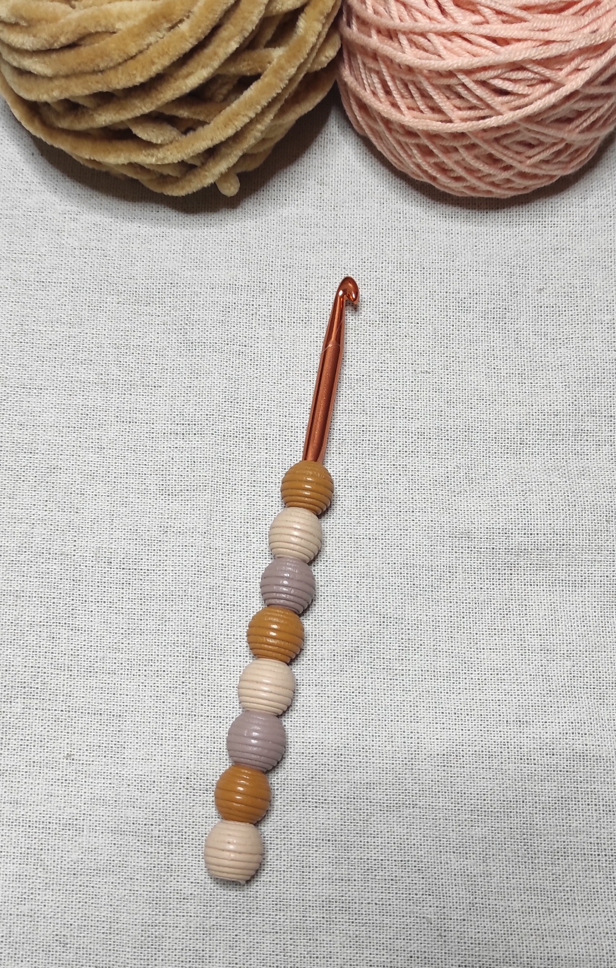 Háček má rukojeť z dřevěných korálků. Velikost háčku je 5,5.