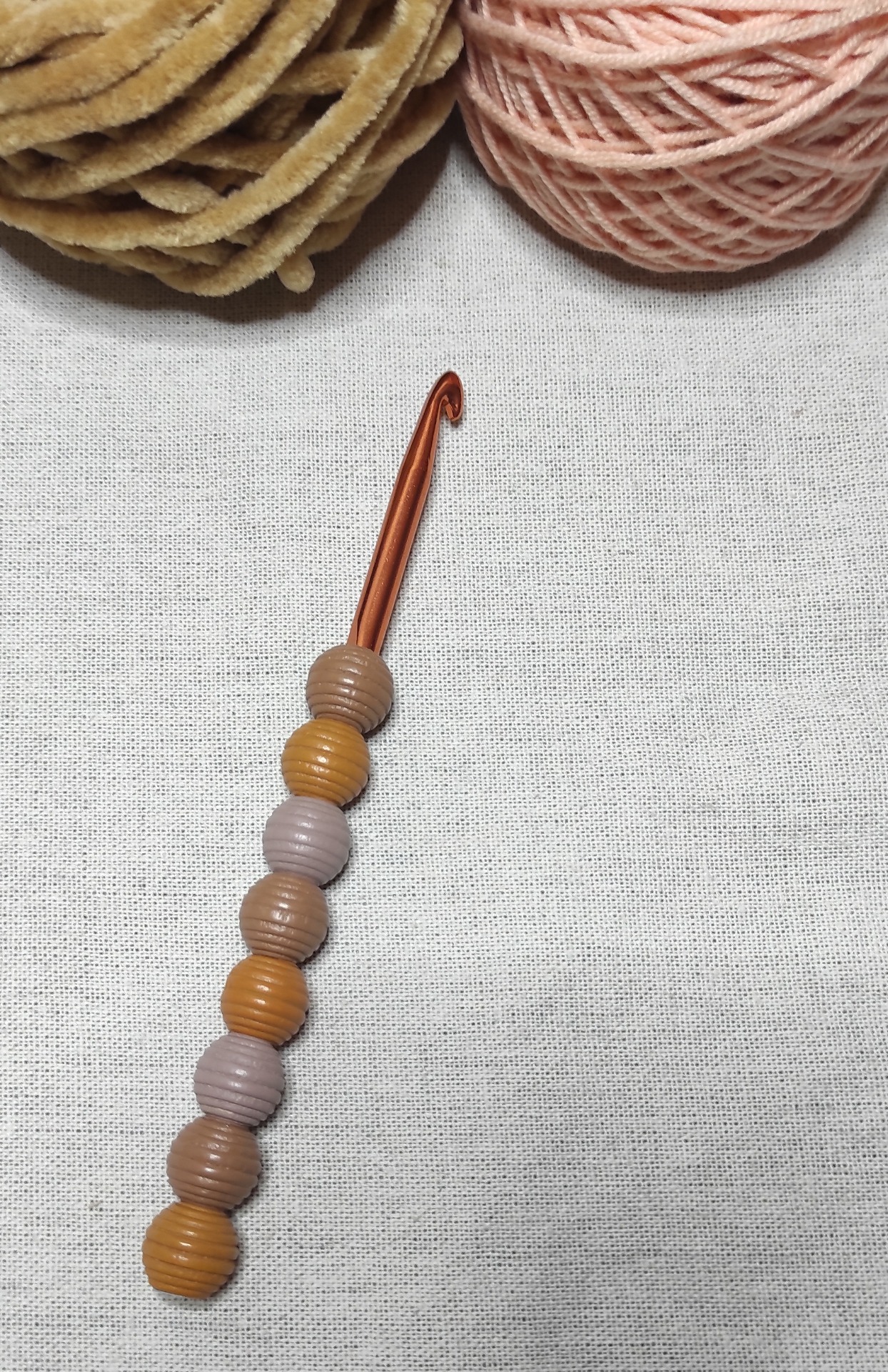 Háček má rukojeť z dřevěných korálků. Velikost háčku je 5,5.