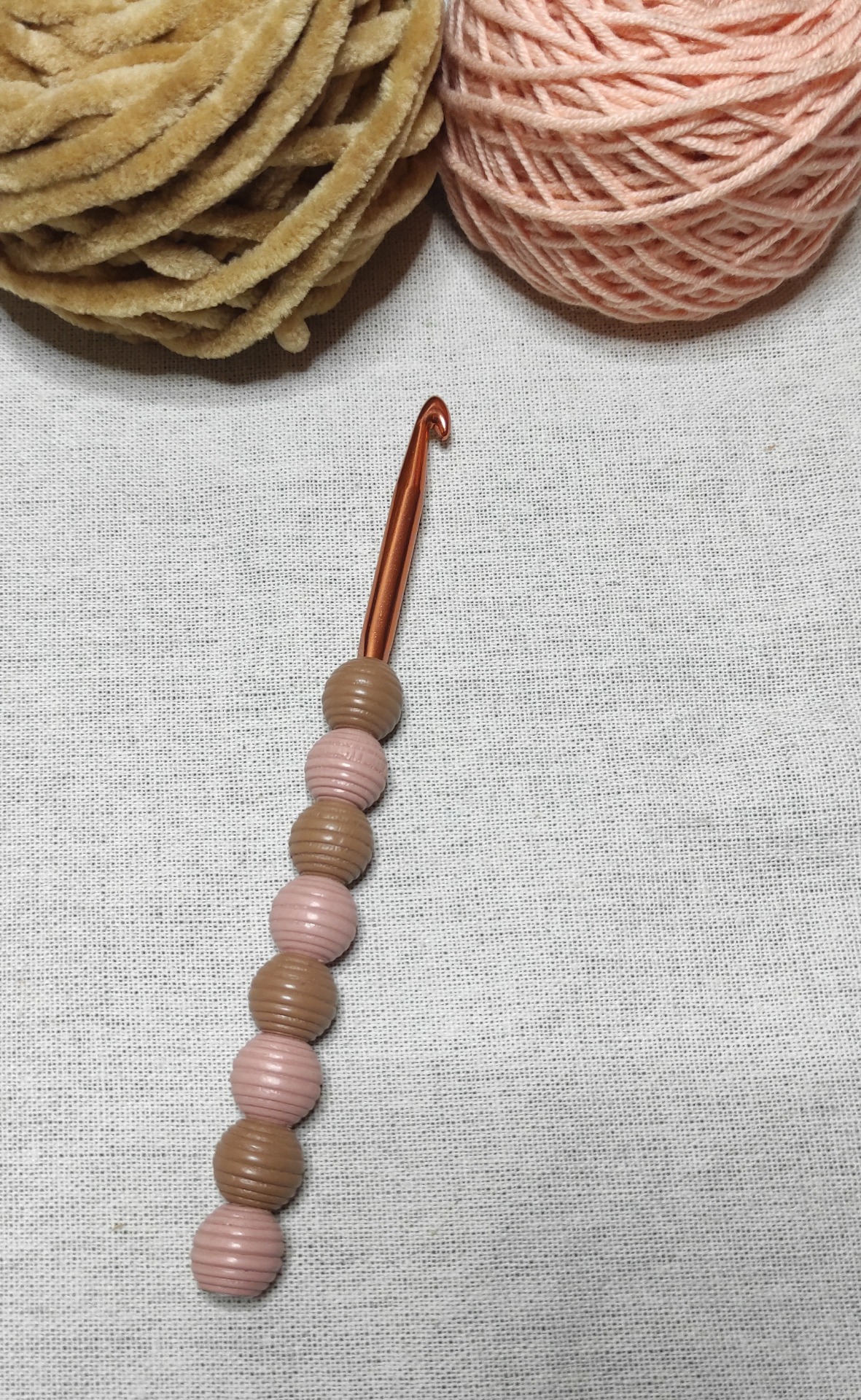 Háček má rukojeť z dřevěných korálků. Velikost háčku je 5,5.